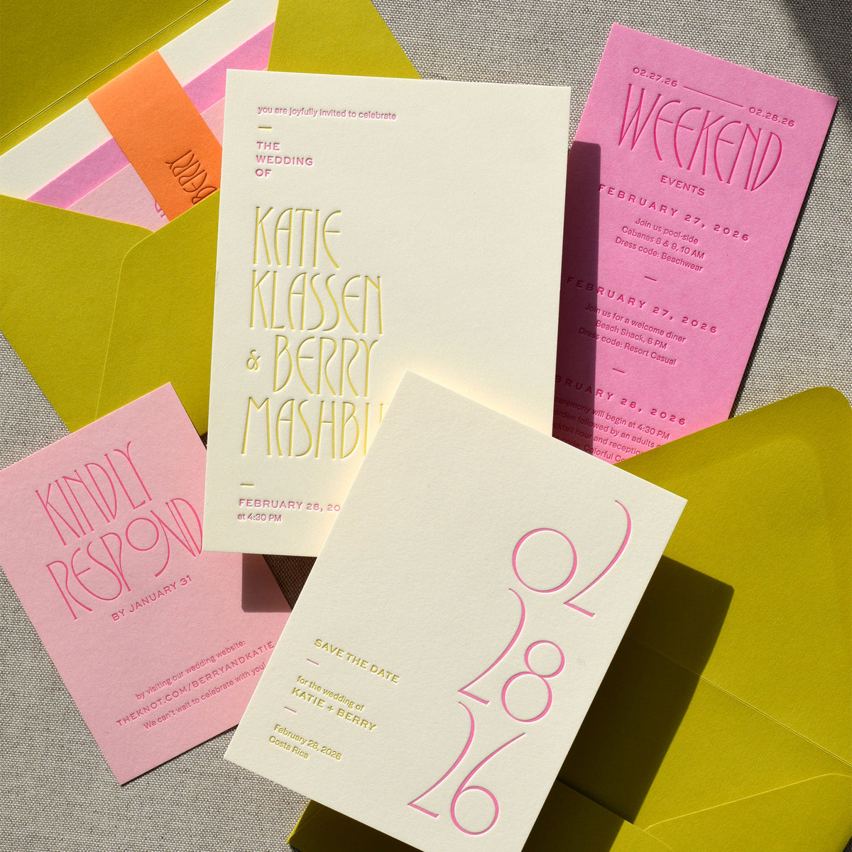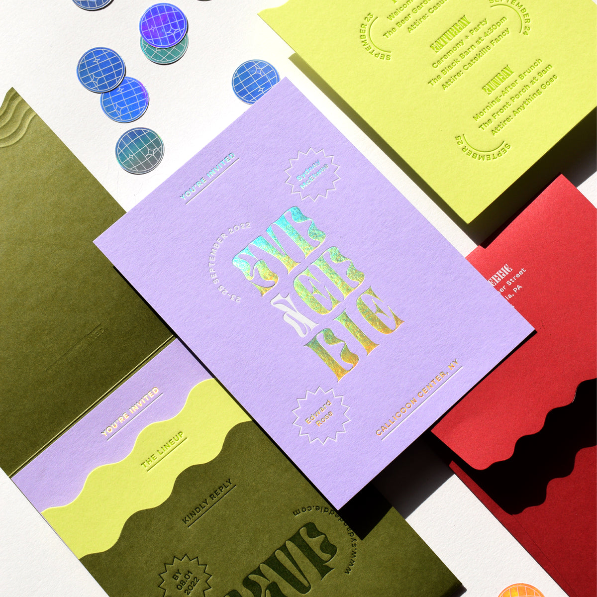 I create bold and colorful wedding invitations, inspired by typography and traditional print methods. I love to collaborate with each and every one of my couples, and I intentionally keep my wedding invitation studio small so I can do just that.