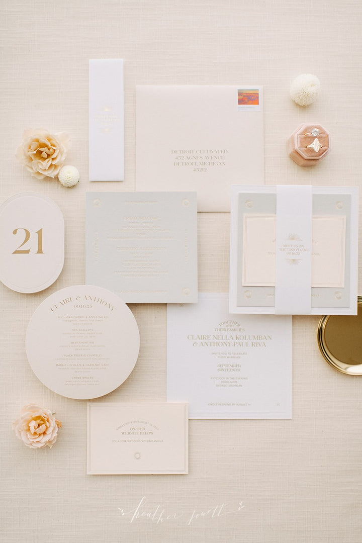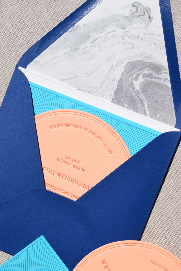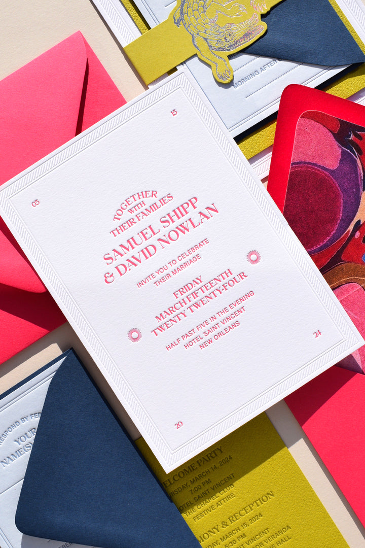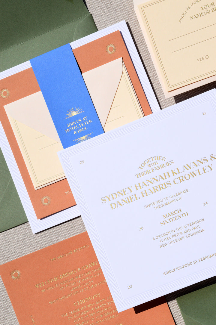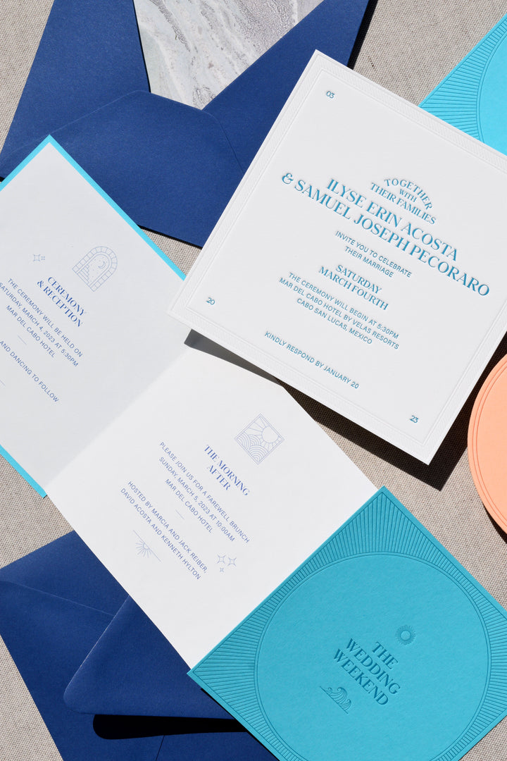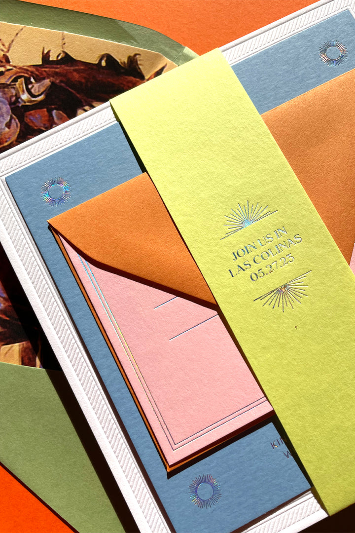 The Bohemia Collection is inspired by modern bohemian typography and the California sun. It uses deep and pillowy letterpress textures, playing with symmetry to create a unique and beautiful invitation suite.