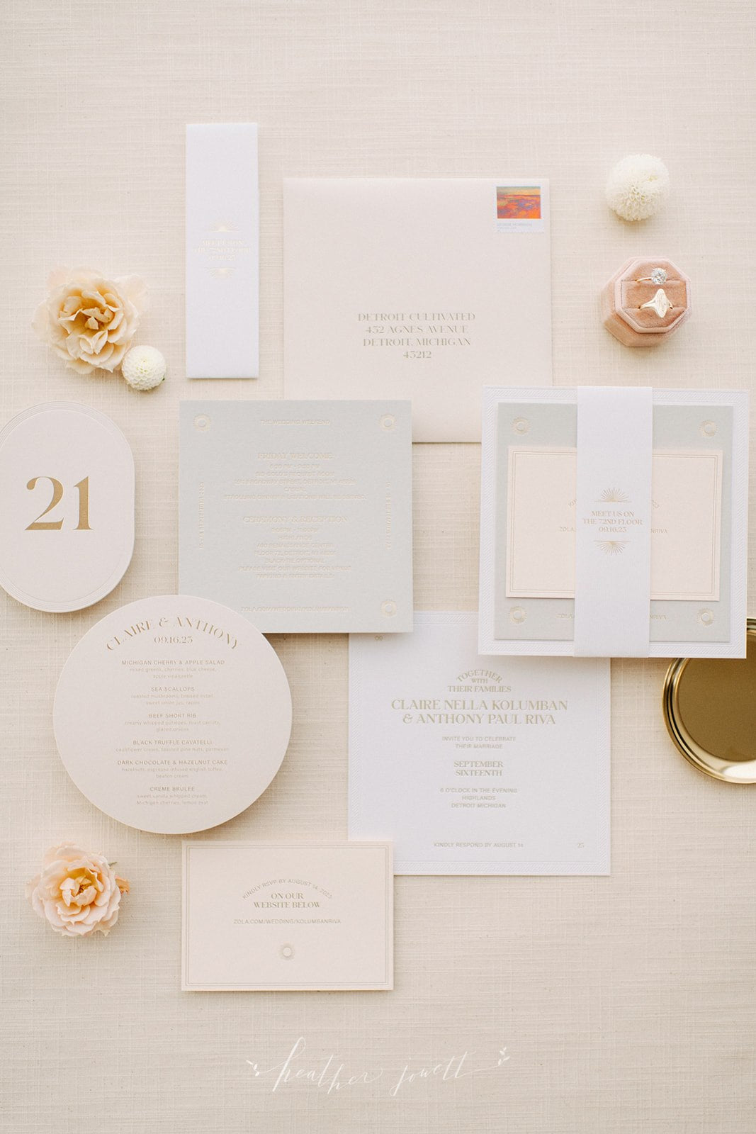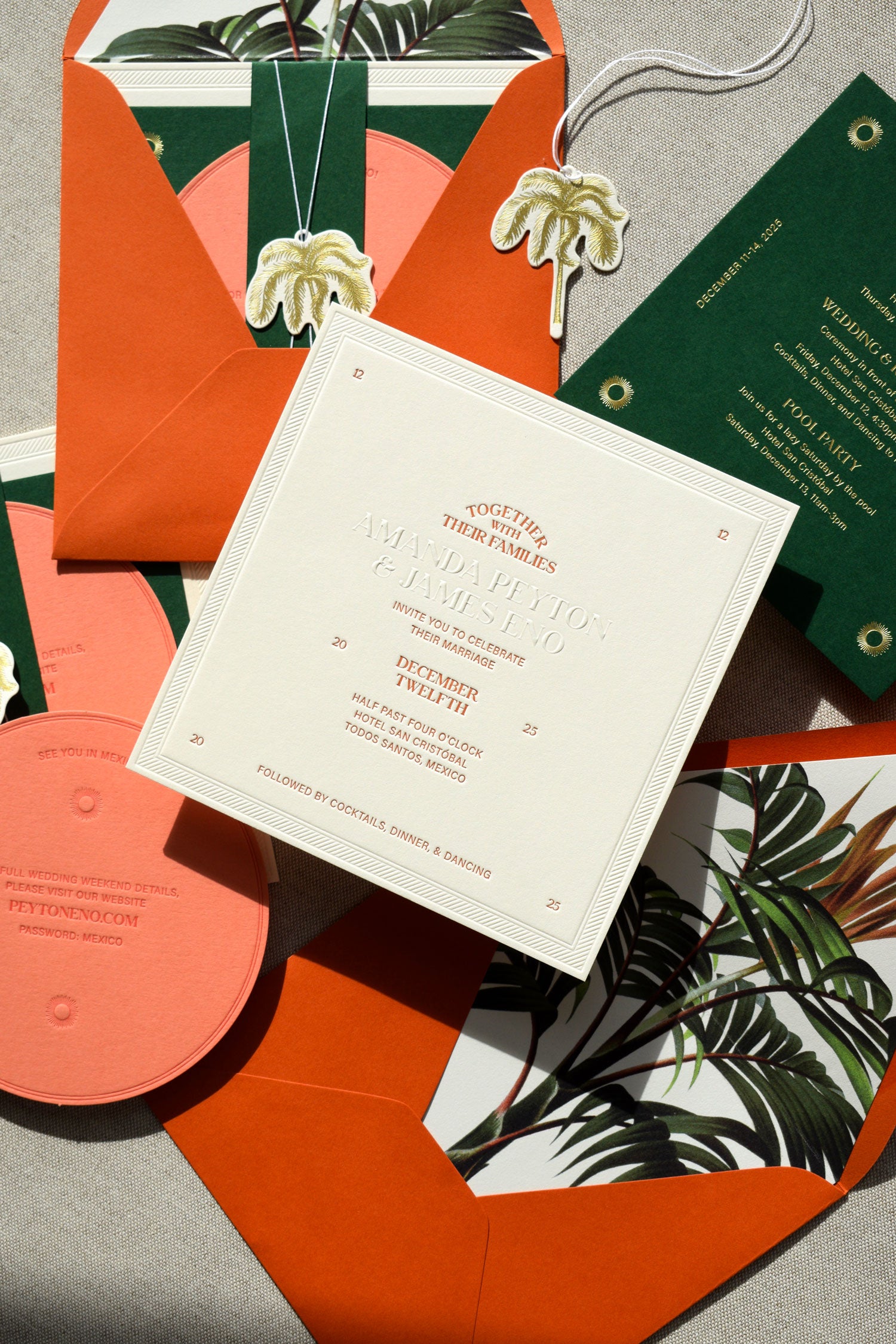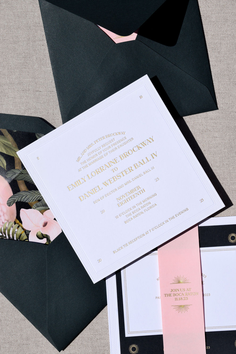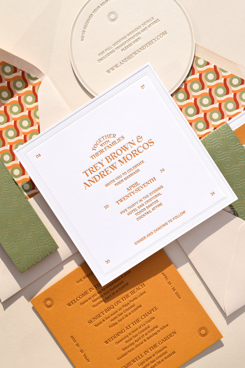 The Bohemia Collection is inspired by modern bohemian typography and the California sun. It uses deep and pillowy letterpress textures, playing with symmetry to create a unique and beautiful invitation suite.